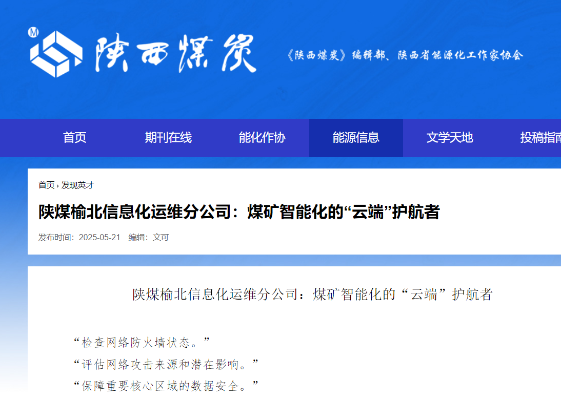 陜西陜煤榆北煤業(yè)有限公司榆林信息化運(yùn)維分公司(以下簡(jiǎn)稱(chēng)運(yùn)維分公司)成立于2019年5月,系陜西陜煤榆北煤業(yè)有限公司(以下簡(jiǎn)稱(chēng)榆北煤業(yè))下屬分公司,屬?lài)?guó)有控股企業(yè),是煤炭行業(yè)首個(gè)智慧礦山建設(shè)團(tuán)隊(duì)。主要經(jīng)營(yíng)范圍:軟件開(kāi)發(fā)及銷(xiāo)售;信息系統(tǒng)集成服務(wù);運(yùn)行維護(hù)服務(wù);信息...
